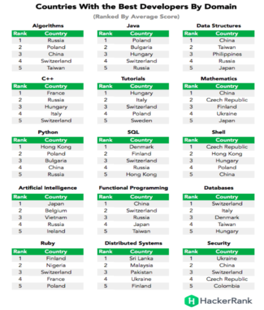 놀랍게도 1위는 중국, 2위 러시아, 3위 폴란드, 4위 스위스, 5위 헝가리 였고, 한국은 22위, 베트남은 23위, 미국 28위, 인도가 31위에 랭크되었습니다. 미국, 인도 개발자의 비중이 가장 높았기 때문에 상대적으로 손해를 본 것으로 분석되기는 하지만 (평범한 개발자들이 점수를 깍아먹었다는 ...), 어쨌든 상식과는 다른 결과가 나왔습니다.