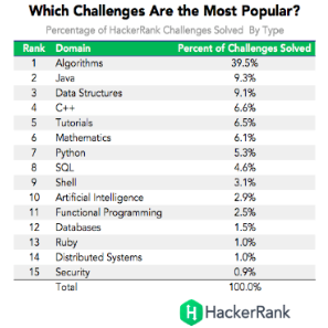 분야가 다양한데 Algorithms, Java, Data Structures, Mathematices, C++, Python, SQL, Ruby, AI 등 15개 도메인으로 평가가 이루어졌습니다.