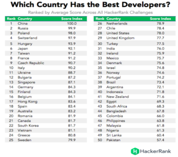 놀랍게도 1위는 중국, 2위 러시아, 3위 폴란드, 4위 스위스, 5위 헝가리 였고, 한국은 22위, 베트남은 23위, 미국 28위, 인도가 31위에 랭크되었습니다. 미국, 인도 개발자의 비중이 가장 높았기 때문에 상대적으로 손해를 본 것으로 분석되기는 하지만 (평범한 개발자들이 점수를 깍아먹었다는 ...), 어쨌든 상식과는 다른 결과가 나왔습니다.